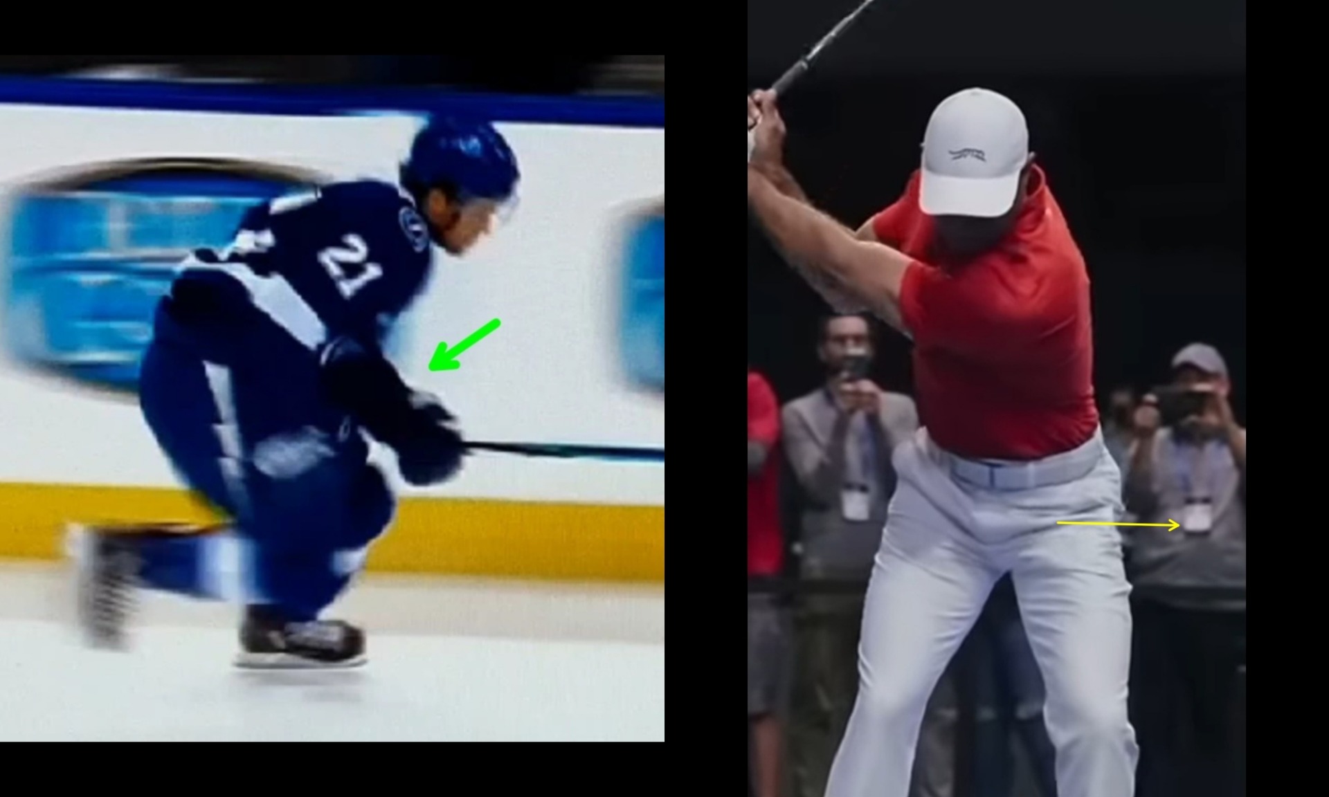 Golfare måste skapa en separation mellan underkropp och överkropp för att sätta fart på klubban. Tigers baksving är inte klar men höfterna går redan mot målet. Hockeyspelare är inget undantag från dessa regler. "frånskjutet" är inte klart än men överkroppen har redan rört sig åt motsatt håll (handsken är redan vid knät). Det tränas på mycket bra saker därute men få som kommer till mig kan "åka skridskor" särskilt väl😒 Jag tror att det är bra för svensk hockey om det blir ändring på det.